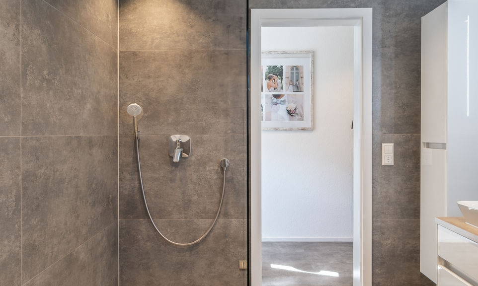 Zwei moderne Badezimmer mit Walk-in-Dusche und Badewanne